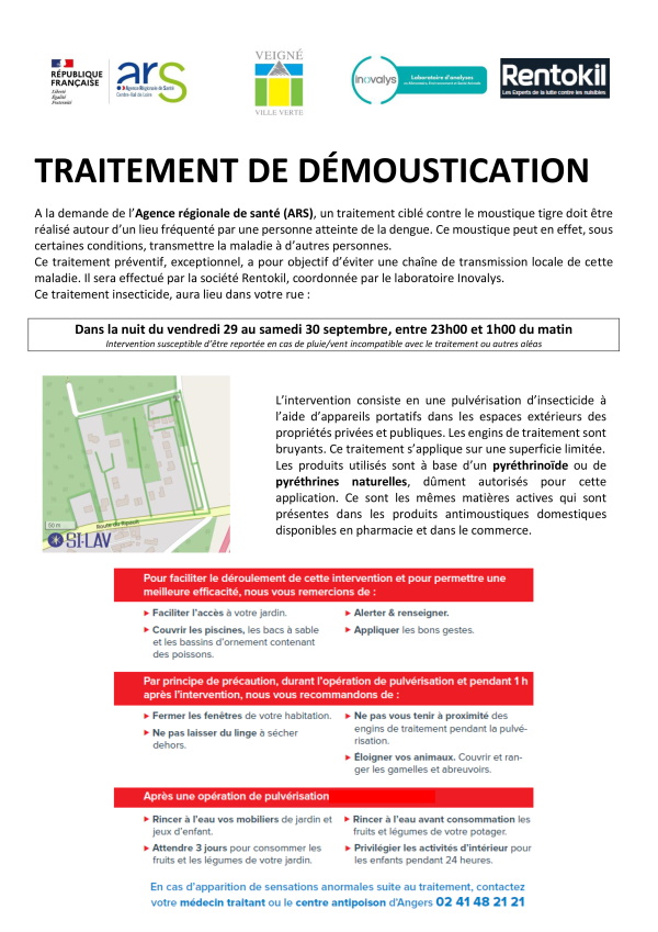 Etant donné que cet insecte peut, sous certaines conditions, transmettre la maladie à d’autres personnes, un traitement sera effectué à titre préventif et exceptionnel, par une société spécialisée, dans la nuit du vendredi 29 au 30 septembre entre 23h00 et 1h00 du matin.